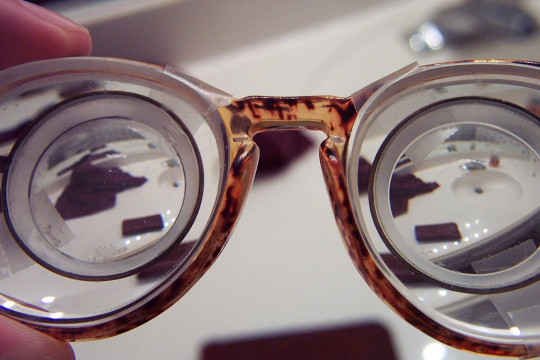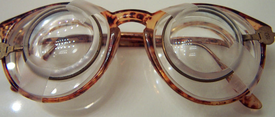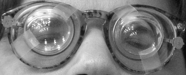 Here are my temporary, makeshift glasses for my GoC. If you look closely, you can see that the trial lens I have taped on to my -12.00 glasses are -20.00. This adds up to -32.00. The glasses are a